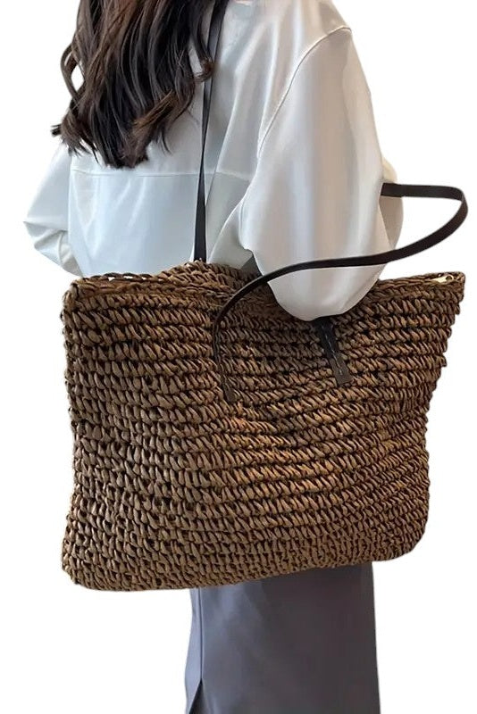Die gewebte Tragetasche ist für Frauen entworfen, die Geräumigkeit wollen, ohne auf Stil zu verzichten. Gefertigt mit einer edlen, handgewebten Struktur und veredelt durch elegante Trageriemen in Lederoptik, setzt diese Tragetasche mühelos ein Statement und bleibt dabei funktional. Mit Platz für alles, was Sie durch den Tag bringt – Laptop, Mittagessen, Schminktäschchen, Buch und mehr – ist diese Tasche ideal für Strandausflüge, Arbeitstage oder Marktspaziergänge. Die gewebte Tragetasche ist Ihr Begleiter für alles, mit entspannter Raffinesse.