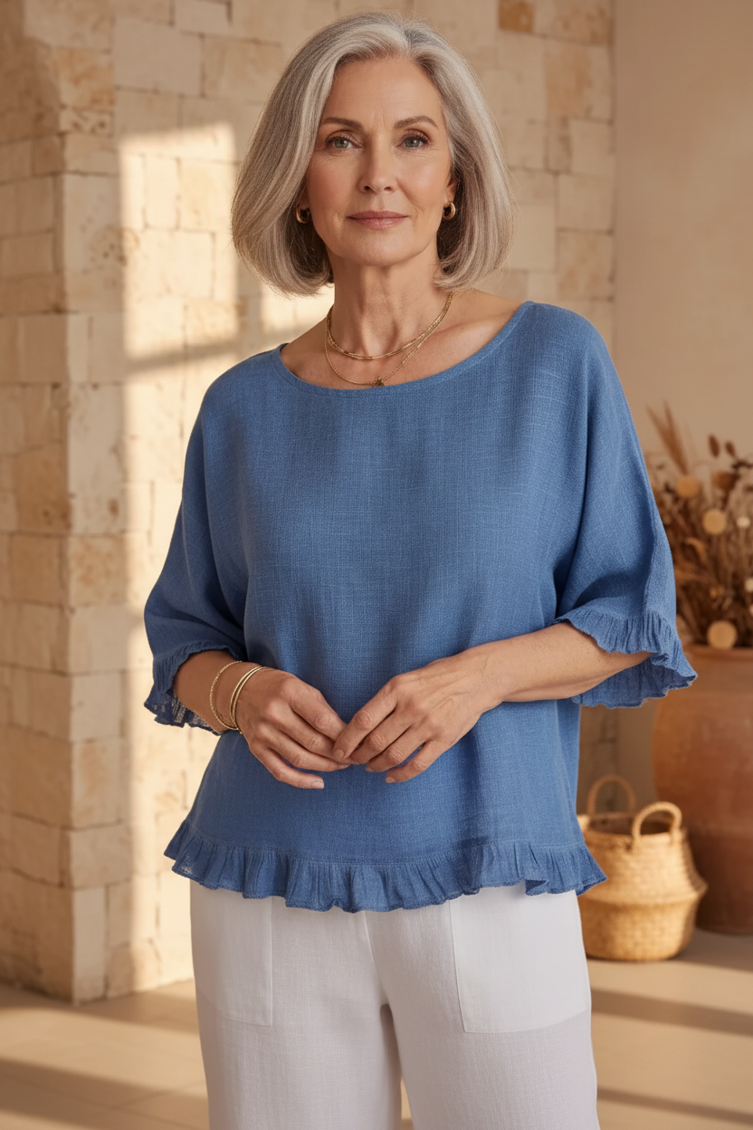 Zarte Rüschendetails: Die subtilen Rüschen entlang des Saums und der Ärmel verleihen einen Hauch von Weiblichkeit und heben das Gesamtbild hervor.